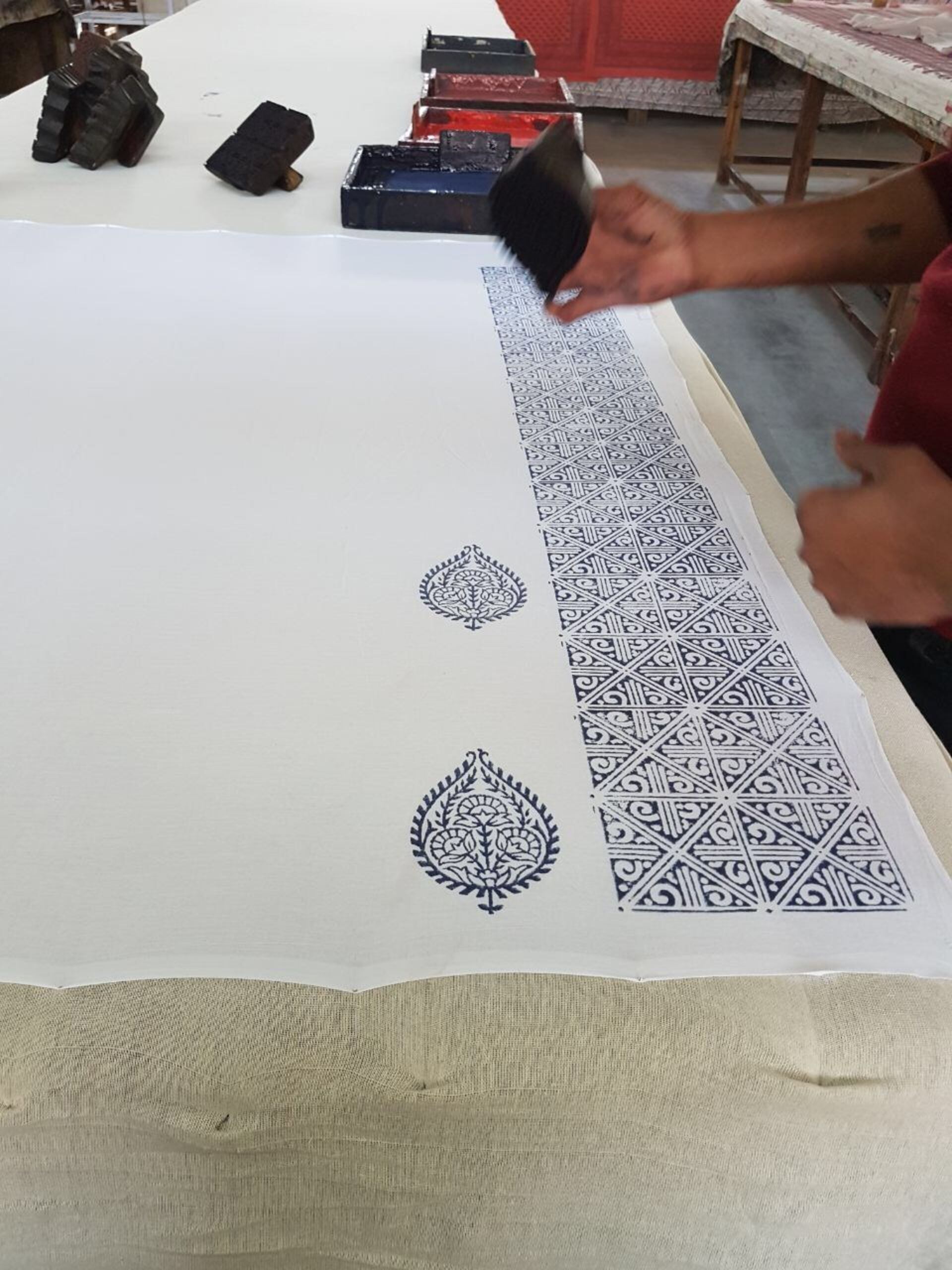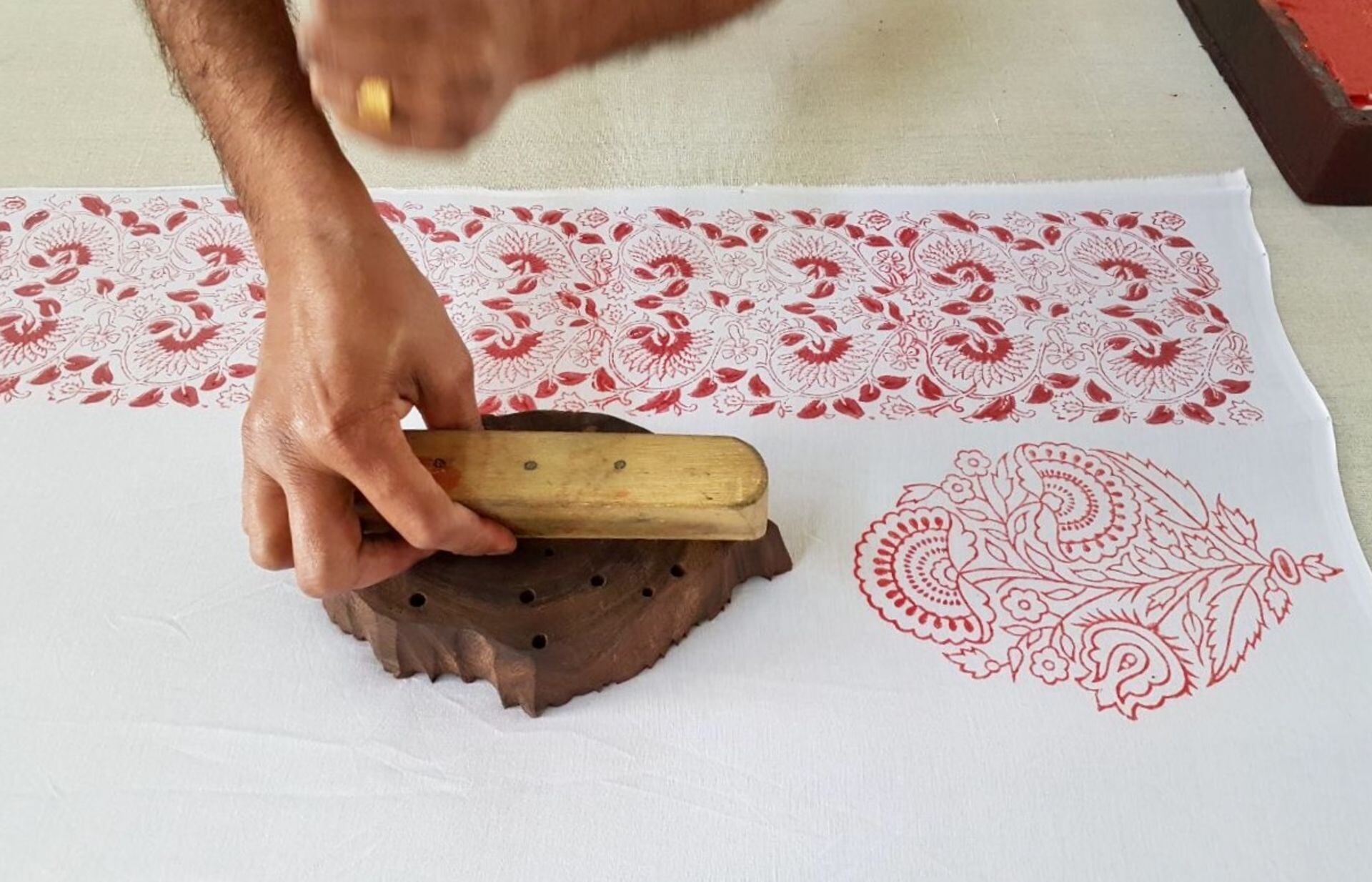 細やかなデザインによる木版のブロックプリントは、リバーシブルデザインで両面に施されています。